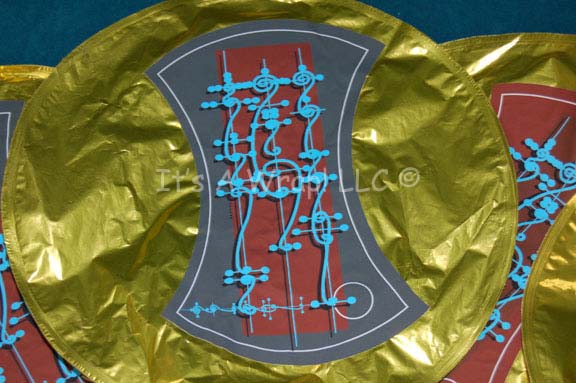 Description: A set of seven similarly sized metallic gold foil colored balloons acquired for use as Vulcan rations packs in the Star Trek: Enterprise episode “Carbon Creek”. The items have plastic ends and each features a Vulcan themed graphical application applied to both the face and reverse. The items measure approx. 11.5 X 9 inches diameter.