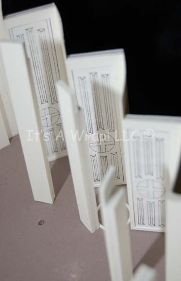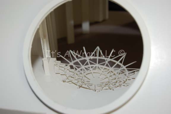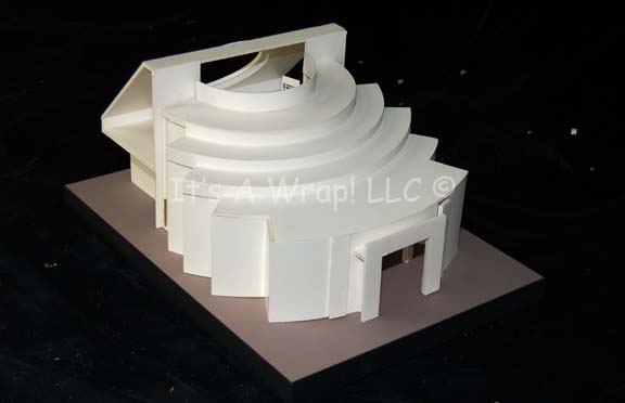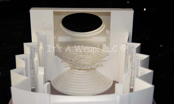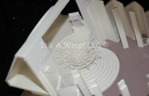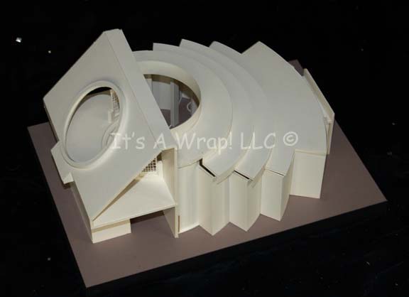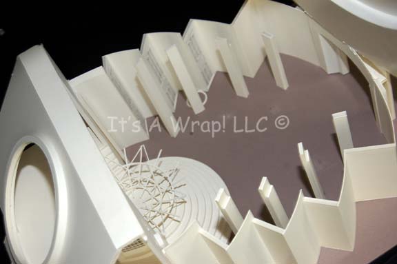 Description: A white foam core model of the “Scimitar” observation lounge set from Star Trek X: Nemesis. When “Shinzon of Remus” (Tom Hardy) chose to reveal himself to the “Enterprise-E” crew it was in this location. The model features an inverse round staircase, a circular window portal and disconnected window frame, a series of pillars offsetting the scale graphics decorating the panels behind, and an entry port. The roof and ceiling remove to reveal the interior either through damage or design. This excellently preserved model measures approx. 18 X 13 X 8.5 inches and stands on a sturdy base.