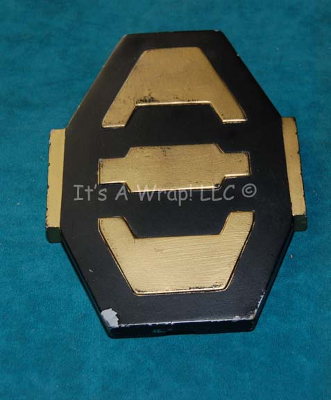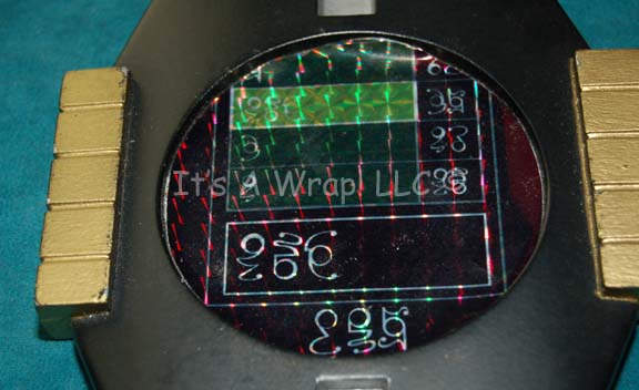 Description: A PADD (Personal Access Display Device) featured in the episode “Borderland” of Star Trek: Enterprise. The item is solid cast resin with an elongated octagonal shape, painted black with metallic silver and gold inset and highlight painted accents and a round centered ‘display screen' with a reflective graphic depicting ‘Orion’ character letters meant to exhibit selections and prices at a slave auction during scenes in the episode. The item measures approx. 7.25 X 5 X .5 inches. The graphic has lost some degree of adhesive quality, but is completely intact.