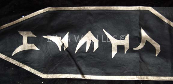 Description: A piece of set dressing similar to those featured in various episodes of Star Trek: Enterprise like “Broken Bow” and “Judgment”. This item is black leather, a vertically hanging banner featuring silver stripes and Klingon iconographic symbols. The item measures approx. 64 X 13 inches.