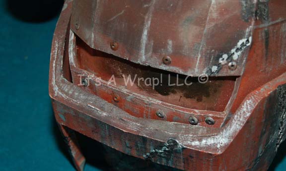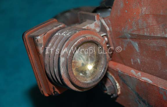 Description: A prop mining mask featured in Star Trek VI: The Undiscovered Country for use by alien prisoners in the dilithium mines of Rura Penthe. The item is sturdy molded plastic painted rust red with multiple points of distress to appear ‘abused’, some spotting of metallic silver paint to appear metal. The item features a pivoting fortification, a see through eye piece, a head ring that is size adjusting, and a pair of currently non-functional lamps on at the temples. It is believed the lights could be made to function again providing a change of bulbs. The item measures approx. 9 X 13 X 12 inches. A single crack is present in the top of the mask with is not believed to be part of the overall appearance of the item.
