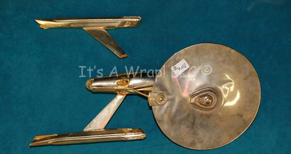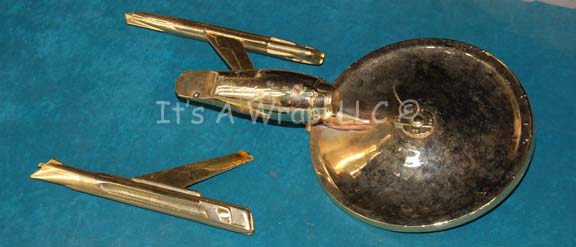 Description: A smashed prop model of the famous starship “USS Enterprise-A” featured in Star Trek VIII: First Contact on the wall of ships in the observation lounge of the “U.S.S. Enterprise-E”. The model is plastic reinforced with metal pins, dipped in a metallic gold metal based compound. The item is distressed to appear ‘broken' in that the port wrap nacelle is removed. The secondary hull (engine section) features a positioned threaded metal pin in the base and the saucer section is loose but attached. A dried glob of adhesive is present where repairs were attempted. The item measures approx. 22.25 X 11 X 6 inches, the removed nacelle measures approx. 11 X 4.5 inches. This is in fact a second auction containing an item matching this, it is not the same item. Multiples are made frequently for productions due to the necessity of multiple takes.