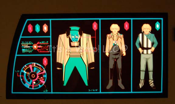 Description: A pair of computer console readouts created in the style of Ferengi characters believed to have been developed for episodes of Star Trek: Deep Space Nine, or a non-production exhibition. The items are a pair of smoked acrylic panels with multi-colored graphical applications adhered to the reverse best viewed when back lit by an external light source. The items depict Ferengi costumes like those worn by “Quark” (Armin Shimerman) and “Rom” (Max Grodenchik), in face the figures depicted in the items appear strikingly similar to the characters. The item is adorned with Ferengi themed console graphics and iconography. One item has yet to have its protective sheet removed from the face, the other is ready for display use. The items measure approx. 37 X 27.25 inches with screw holes for wall mounting.