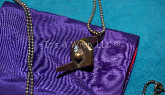 Description: “Captain Picard” (Patrick Stewart) arrives on the bridge of the “Enterprise-D” to discover the ship has located an alien probe. In seconds he has been floored by a scan from the probe and is no longer on the “Enterprise”. When he wakes, he finds himself in the care of a woman he does not know who claims him to be her husband. Over the next twenty-five years, Picard becomes “Kamin” and lives an entire lifetime with the people of the world, has children, and watches them growing up, all the while certain that the world is doomed by the star it orbits. In his last moments with the aliens, he discovers the truth, that the probe selected him to be keeper of their memories. The item is a prop necklace featured in the beloved Star Trek: The Next Generation episode “Inner Light” made for wear by “Eline” (Margot Rose), wife to “Kamin” (Patrick Stewart). The item is a ball chain necklace with a ring clamp on which hangs a pendant, bronze colored metal shaped hexagonally with vaguely triangular ‘blades' affixed to its opposing sides, and with a centrally located metal dome accent made to appear like the alien probe. The item measures approx. 1.5 X .5 inches on an approx. 24 inch long chain.