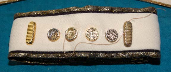 Description: A wardrobe lot created for use on Starfleet officer's uniforms in various Star Trek feature films. The items are gold trimmed command division strips; one is made to be affixed to the right shoulder back and clasped to the front of the uniform, the other for the left forearm sleeve. The sleeve strip is adorned by four gold colored metal ’10 year’ service pins with molded in Starfleet emblems and two similarly fashioned commendation bars while the shoulder strip features a ‘security disk’ made from molded resin. A stain from the security disk is present where the item is believed to have been folded over in storage.
