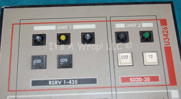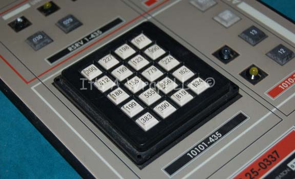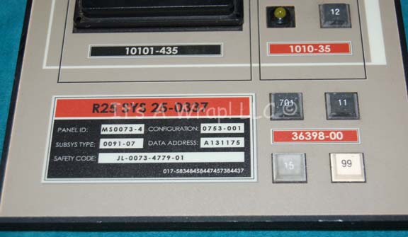 Description: A piece of set dressing similar to those featured in various episodes of Star Trek: Enterprise. This item is inscribed ‘R25 SYS’ and features a gray, graphical application attached, several banks of multicolored, rubber faux buttons, a large black button board with white buttons that actually depress, several LED lights with the untested electronics that power them on the back, a long, gray wire leading out from it and adhesive strips from production use on either side. The item measures approx. 11 X 7 inches.