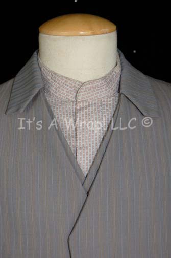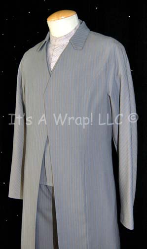 Description: A costume featured in the Star Trek: Voyager episode “Ex Post Facto”, wherein “Tom Paris” (Robert Duncan McNeil) is convicted of murder but denies the charge even though the victim's own memories seems to contradict him. The costume is for wear by Ray Reinhardt in the role of the Banean physicist who was reputedly murdered by “Tom Paris”, “Tolen Ren”; it consists of two long-sleeved button-down shirts featuring a red “x” pattern and blue stripes, a gray, pinstripe suit jacket with a short collar, that buttons down halfway, a pair of corresponding overall style trousers, a matching vest, and a pair of gray socks. The jacket, one of the trousers, a shirt, and vest were reused in the Star Trek: Enterprise episode “Doctor’s Orders” and have a sewn in Enterprise tag that reads ‘David Kimball #13’. A sewn in Voyager tag in the other trousers reads ‘Voyager, Ray Reinhardt’; one costumer’s tag reads ‘108 Ex Post Facto, Tolen Ren, Ray Reinhardt’ and a second ‘Enterprise #013 Dear Doctor, Esaak, David Kimball’.
