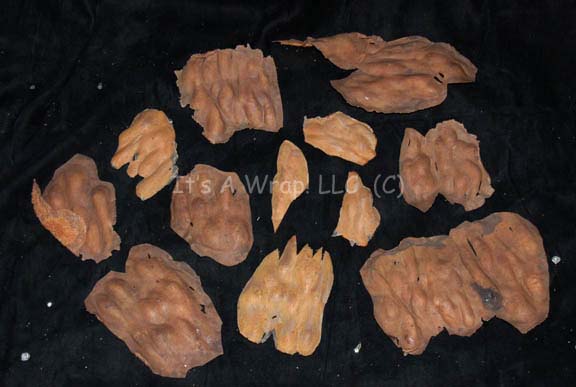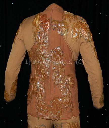 Description: A special effects costume lot featured in the Star Trek: Deep Space Nine episode “Broken Link” for wear by Rene Auberjonois in his portrayal of a very ill “Odo”. The costume is a pair of mustard colored Bajoran security officer uniform tops and one set of trousers, with a pair of boots, and a selection of special effects make up applications. Due to events in the episode, the costume pieces are covered in special effects make-up in a successful attempt to make the wearer look as though he were ‘melting’. The make-up is foam rubber painted to match the uniform with a sheen added to create the illusion of wetness. The trousers feature a sewn in Deep Space Nine tag reading ‘Rene Auberjonois’ and are covered in the effect from just below where a uniform jacket hangs to just above where uniform boots rise in the shins, the ankles of the trousers have specialized stirrups that allow the front of the foot to come out of the cloth but leave the heel still inside. The first jacket is meant to represent an earlier stage in the illness of the character and is inscribed ‘40%’ inside with a sewn in Deep Space Nine tag and further inscriptions reading ‘Stage 1, 40%’. Due to time and storage conditions the effect make-up in the jacket depicts a degree of damage that is shared by all of the costume uniform: some of the effect has peeled off, some of it has torn away from the fabric entirely but still hangs thus revealing the foam construction element, and original protective plastic wrap had adhered irreversibly to sections of the effect. The second jacket is meant to show a further decay in the character and is inscribed ‘60% Stage 2’ inside with all the same decay. The jackets both feature metal Bajoran combadges and zip up the spine. The boots were located separately of the lot but are included for a more complete item. The lot also features a selection of special effects pieces either for application to the actor or for touch up of the costume. Twelve variously sized, similarly colored items meant to represent a decay of the character are present. The costumer’s tags read ‘DS9 Odo, Rene Auberjonois, 1 uniform jacket w/ dripped rubber (distressed)’, the other costumer’s tag is nearly identical in that it includes ‘pant’ referencing the trousers, the third indicated it’s original position in the original inventory.