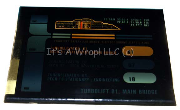 Description: A pair of computer interface panels believed to have been part of the “USS Enterprise-E” set. The items are turbolift readouts and controls and are composed of smoked acrylic panels with graphical applications applied to the reverse that are visible when backlit. One item depicts a cross section of the topmost section of a starship including the main bridge, upper portion of the computer core, and an orange indication of a turbolift shaft. The display graphic depicts the location of turbolifts 1 through 4 in blue and yellow, and reads ‘Starfleet safety protocols in effect during alert status’. The second piece is also an LCARS-style (Library Computer Access and Retrieval System) display indicating ‘Turbolift 01: Main Bridge’. The items measure approx. 4.5 X 6.5 inches and 6.5 X 5.5 inches with beveled edges and the reverse retains the remains of adhesive used to apply the items to set pieces. These two items are a second set similar to a previous auction; the direction of wording faces the opposite way from the previous listing and colorations are differently positioned.