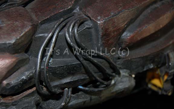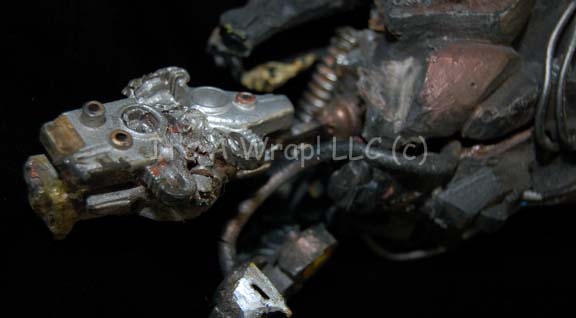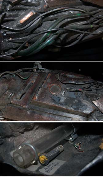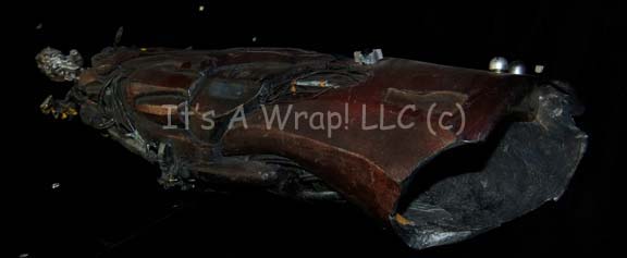 Description: A prop Borg arm appearing variously in Star Trek episodic television and feature films. The item is composed of molded resin, acrylic tubing, and plastic components. The exterior is painted to appear as a mismatch of technology, metallic copper, silver, with wires and tubes. The interior is slightly padded for ease of wear with an acrylic tube mounted within. An internal label reads ‘Mark Buccola’. Measures approx. 24 X 7 X 4 inches with multiple loose items present which have broken off due to time and storage conditions.