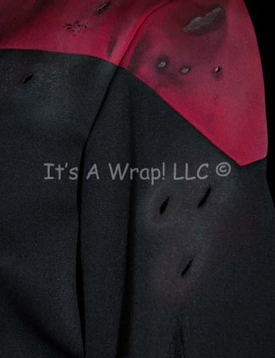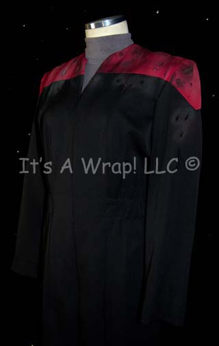Description: This Starfleet uniform jumpsuit is black with Command Red division shoulders that zips up the front, clasps at the top, and features a Velcro patch on the left breast for a Starfleet ‘commbadge’ (sold separately). The waist features form fitting black elastic with sewn in loops for ‘away team’ gear, the feet end in black elastic stirrups. The costume comes with a gray turtleneck undershirt that zips up the back; it is intentionally distressed along the shoulders of the jumpsuit with numerous scorch and burn marks. A sewn in Voyager tag in both garments reads ‘Sue Henley’ and was a regular stand-in for “Kate Mulgrew” throughout all seven seasons of Voyager.