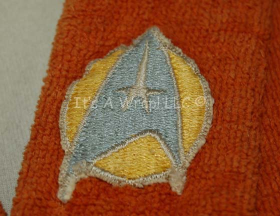 Description: An enigmatic robe colored burnt orange with cropped sleeves and pockets, a sewn on yellow backed Starfleet emblem patch on the left breast reminiscent of those appearing on Star Trek I: The Motion Picture uniforms. However, while those assignment patches are very round with black trim and a black star in the center, this one is oblong, comparatively, and has white trim and a white star. This item is believed to have been used in make-up and hair departments prior to filming, or set wear for comfort.