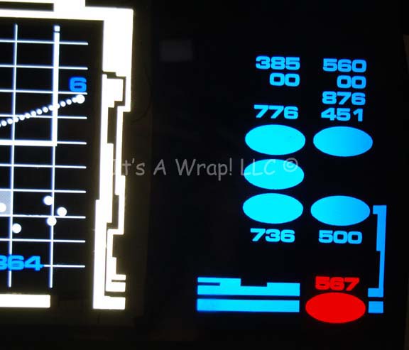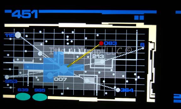 Description: A console computer interface like those appearing variously in Star Trek feature films and occasionally in episodes of Star Trek: The Next Generation. The item is two sets of clear acrylic with a graphical application pressed between them. The graphic depicts in a green and blue theme a map reading with several directional points and numeric values. The item measures approx. 25 X 12 inches and is best viewed when back lit by an external light source.