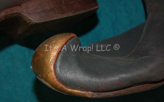 Description: A pair of tall, gray-colored leather boots featured in Star Trek IV: The Voyage Home for wear by Vulcan Technicians working on the captured Klingon Bird-of-Prey. The boots very likely made appearances on Vulcan Khitomer attendees in Star Trek VI: The Undiscovered Country and could have shown up generally any other time Vulcan characters were needed in traditional costume. The depict use on the soles which are in fine condition, have upturned gold-colored toes, and a label inside that appears to read ‘Bob Drumming’.
