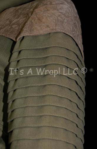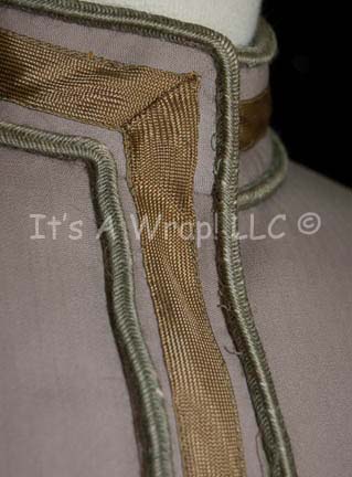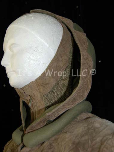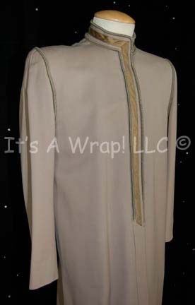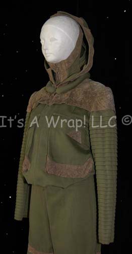 Description: A lot of two costumes featured in the Star Trek: The Next Generation episodes “Deja Q” and “The Outrageous Okona” respectively. The first costume is that of one of the Bre’el IV scientists that the “Enterprise-D” is attempting to help, it consists of long, olive-colored trousers; functional flap topped pockets and attached leather work. A corresponding olive-colored, long-sleeved jacket featuring similar brown leather work, attached hood with matching netting dickie inside that covers all but the face, and ribbing down the sleeves. A sewn in tag reads ‘Mel Ladia’, a sewn in Deep Space Nine tags denotes reuse by ‘Peter Martin’, and a costumer’s tag mistakenly refers to the costume as a “Calamarian Scientist” instead f a “Bre’el IV Scientist” but lists the episode, episode number, and ‘Mel Ladia’ again’. The second garment is a long-sleeved, long jacket in gray, almost mauve color featuring sage-colored accents around the shoulders, collar and down the front with gold-colored accents everywhere the sage is except the shoulders. Included are gray, leather mid-calf boots with Velcro closures around the top. An attached costumer’s tag reads ‘130 Outrageous Okona, Okona, Bill Campbell’.