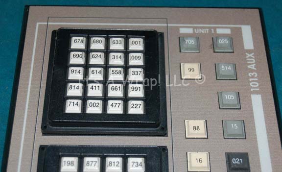 Description: A systems access board appearing variously in episodes of Star Trek: Enterprise. The item is a sheet of smoked acrylic with beveled sides and a graphical application adhered to the face. The item also features multiple rubber faux buttons and two banks of white buttons that are all individually labeled with numeric values and depress. The item features an inventory label as part of the application that depicts the item as part of ships control functions. Measures approx. 11 X 6.25 X 0.25 inches.