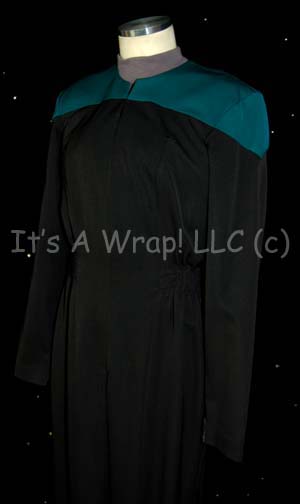Description: This Starfleet uniform jumpsuit is black with Sciences Blue division shoulders that zips up the front, clasps at the top, and features a Velcro patch on the left breast for a Starfleet ‘commbadge’ (sold separately). The waist features form fitting black elastic with sewn in loops for ‘away team’ gear, the feet end in black elastic stirrups. The costume comes with a gray turtleneck undershirt that zips up the back and has light fading under the arms. A sewn in Voyager tag in both items reads ‘Maureen Nellis’ and a costumer’s tag reads the same.