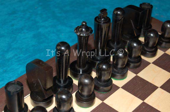 Description: A chess board lot like the one featured in the Star Trek: Enterprise episode “Observer Effect” for use by “Travis Mayweather” (Anthony Montgomery) and “Lieutenant Reed” (Dominic Keating). The lot is composed of a chess board and all corresponding black and white pieces made from wood, shaped to an ultra modern appearance. The board is wood with an attractive dark frame and white wood finish and has three of four felt no scratch feet adhered to the bottom. The pieces all share this aspect, no scratch felt bases. The king pieces being the tallest measure approx. 3.75 X 1.5 inch diameter base. The board measures approx. 19 X 19 X 1 inch.