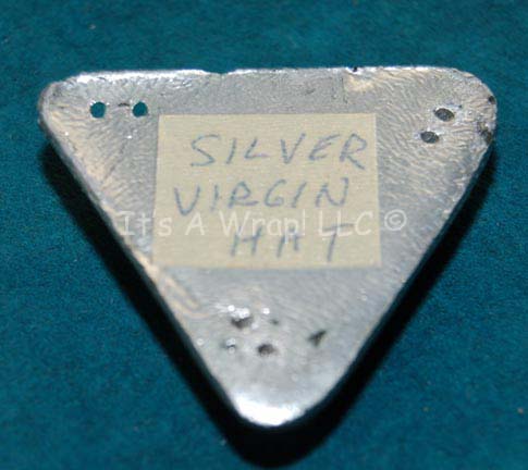 Description: A Vulcan jewelry item like those appearing in Star Trek III: The Search for Spock and Star Trek VI: The Undiscovered Country. The item is a molded paste badge fashioned to be triangular with a metallic silver painted border and a translucent iridescent raised aspect that features a painted on Vulcan iconographic letter. The item features a set of holes for sewing onto a costume and a chip out of the top. The reverse features an adhered label that reads ‘silver virgin hat’. The item measures approx. 2.25 X 2.25 X 2.25 X 0.5 inches.