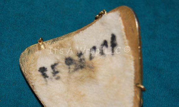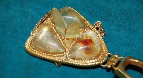 Description: A prop item featured in the third Star Trek feature film, “The Search for Spock”; wherein the Original Series crew hijacks the “Enterprise” and return to the newly created Genesis Planet to retrieve “Spock” and take him back to Vulcan. This item is a bracelet piece of costume jewelry worn by one of the handmaidens in the processional of Spock's body to reintegrate his katra into his body, it is gold-colored metal that consist of two parts: the first part features vaguely triangular shapes with a housing for a cloudy white and green “gem”, a strap/chain the goes around the wrist, a hinge that sets where the wrist would be, three triangular “gems” similar to the first, two “crystals” in the middle, on gold-colored setting with textured accents, a second chain around the hand and a final one that secures around the middle finger. The item measures approx. 8 X 3 X 2 and has the name “Rebecca” written on the underside.