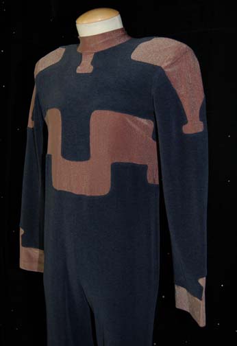 Description: A costume featured in the Star Trek: The Next Generation episode “Starship Mine”; wherein “Captain Picard” (Patrick Stewart) finds a band of mercenaries have beamed onto an abandoned “Enterprise-D” to steal trilithium resin from the warp core. The costume is that of one of the mercenaries posing as a waiter on the Remmler Array, a long-sleeved, full-length dark-blue velveteen jumpsuit with textured segments and iridescent gray inset. A sewn in Star Trek: TNG tag reads ‘Mr. A. Reed’ with a Voyager tag on top of it reading ‘John Kepley’, and a costumer's tag that reads ‘#244 Starship Mine’ Waiter/Alien, Arlee Reed’ and indicates its components.