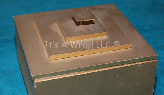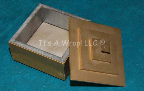 Description: A piece of set dressing similar to those featured in various episodes of Star Trek episodic television. This item is a small box or case used as set dressing, it is square, gold-painted wood with a stepped top, metal handle, and a cushioned inside. The item measures approx. 6 X 6 X 4.5 inches.