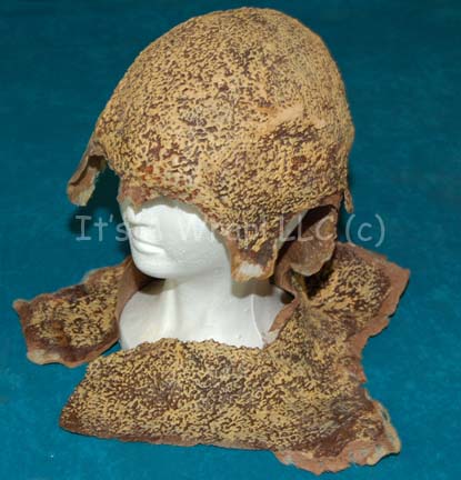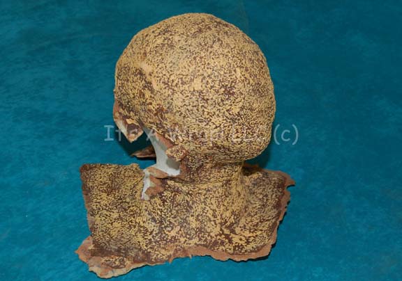 Description: A special effects make-up full head wrap intended to be an adult Suliban appearing variously in episodes of Star Trek: Enterprise. The item is molded foam rubber made to appear blotched and painted brown with a topcoat of tan. The item is in good condition overall with a supple feel generally, the edges of the item are in good condition with some dry areas.