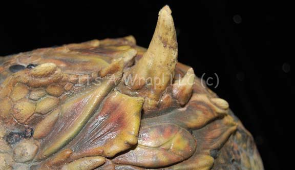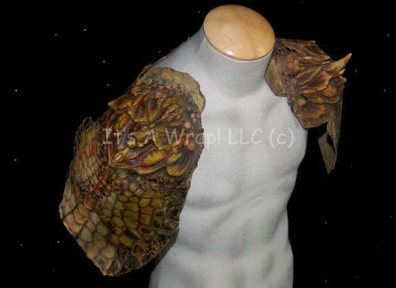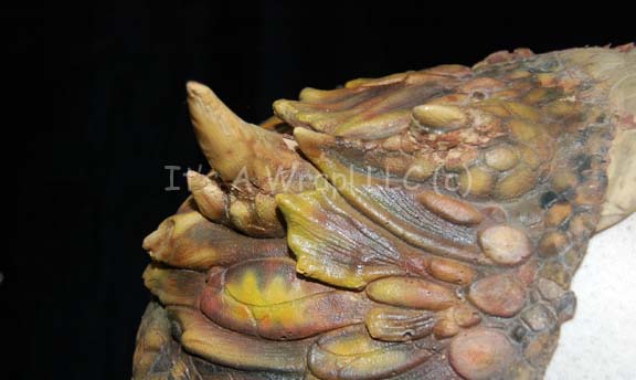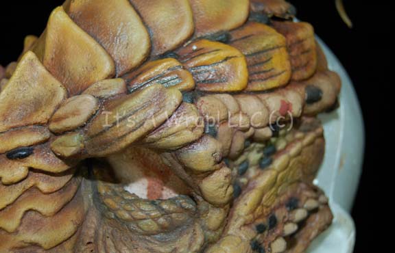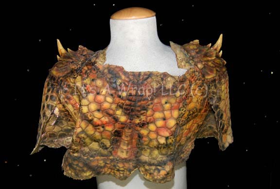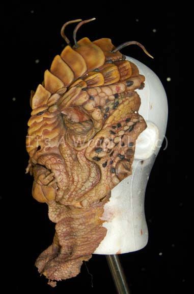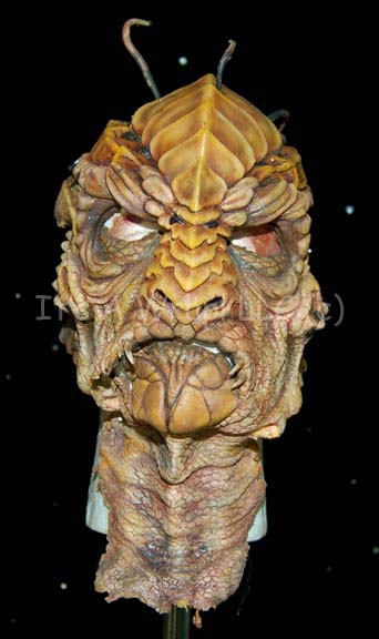 Description: A special effects head and chest piece featured in various episodes of the third season of Star Trek: Enterprise. Their facial structure is distinctly reptilian with scaly ridges and prominent brows. Small tusks protrude from around the mouth and black spikes protrude from their heads. This delicate latex prosthetic was used to create the Xindi-reptilian appearance and is airbrushed extensively to create skin texture, shadows and definition. A matching chest and shoulder piece is included; latex as well, featuring larger tusks than the face and made with the same texture, shadows, and definition, it is known to be worn by Scott MacDonald in the role of the most prolific Xindi-Reptilian on the show, “Commander Dolim”.