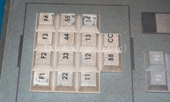 Description: A button panel like those appearing variously in episodes of Star Trek: Enterprise like “Horizon” and “First Flight”. The item is fashioned wood with rubber faux buttons affixed to the face. A graphical application is adhered to the face as well. The edges of the face are beveled to depth and the wood is painted metallic silver. Measures approx. 14.5 X 6 X 1 inch.