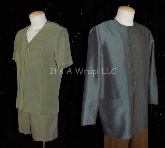 Description: A lot of costumes featured in various episodes of Star Trek: Enterprise including “Bounty”. This lot consists of a long-sleeved, metallic-green shirt in the same quasi-smock style all “Dr. Phlox” (John Billingsley) was made with small, raised stripes, buttons down the front, a pocket on each side and brown, boucle trousers. A light-green, short-sleeved shirt with buttons down the front, raised, stripes, and matching trousers that appears to be the stunt version of the ones worn in the episode “Bounty”. All items feature a sewn in Enterprise tag, the first shirt tag reads ‘John Billingsley’, the trousers’ name has worn away, and the name of both the sort-sleeved, shirt and shorts denotes wear by veteran Star Trek stuntman ‘Vince Deadrick’.