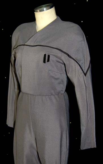 Description: A costume featured in part one of the finale episode of Star Trek: Voyager, “Endgame: Part I”; wherein a future “Admiral Janeway” goes back in time to try and get the crew home faster than it took her originally and prevent the casualties that resulted from such an extended trip. This costume is a future-style, Starfleet cadet uniform consisting of a long-sleeved, full-length, gray jumpsuit with a false, wrap-around style front, black horizontal piping across the front, black trousers with stirrups for the feet, Velcro patch for the future style commbadge (sold separately), and a zip up the back. A Muto Little, Los Angeles, tag is present, as well as a sewn in tag that reads ‘Breece Wilson’; a costumer’s tag ‘ST: Voyager #748, Starfleet, Breece Wilson’.