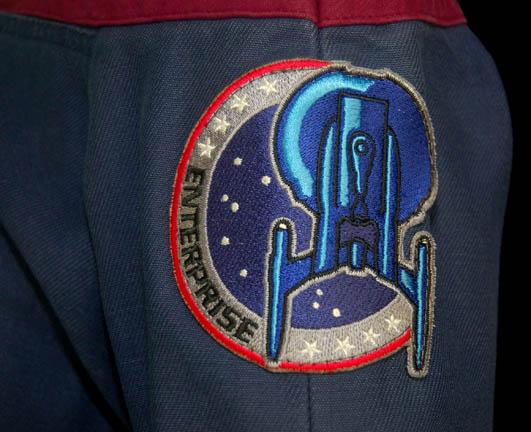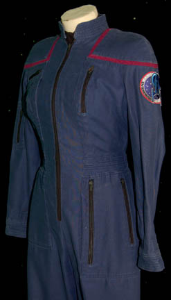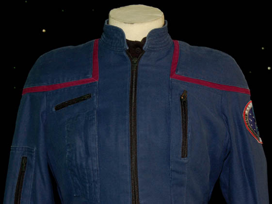 Description: A costume featured in various episodes of Star Trek: Enterprise. This costume is a Starfleet uniform jumpsuit consisting of a full-length, long-sleeved, blue jumpsuit with seven functional, zipped pockets, Operations Red division strip, zip/Velcro cuff adjustment for the wrists and ankles including the famous ‘Enterprise NX-01’ left shoulder patch, and a black, long-sleeved, button-down, undershirt. A sewn in Enterprise tag in both items identifies wear by ‘Kyla Kuhner’ and a costumer’s tag has, on the back, explicit measurements; 5’5 ½, 115, 33 B, 36 H, 31 I.