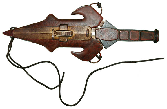 Description: A cast rubber prop knife painted metallic bronze to give it an aged or rusty appearance. The sheath is formed plastic painted to look aged with attachments for leather ties. Klingon knives like this have been seen in many Star Trek feature films like ‘Star Trek III: The Search for Spock', and in episodic television like Star Trek: The Next Generation, Deep Space Nine, and most recently Enterprise. Measures approx. 18 x 6 x 1 1/2 inches.
