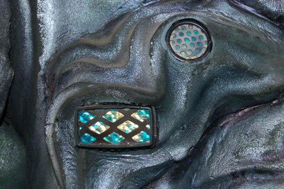 Description: A black full length cast rubber body suit painted with silver details to give it an armored appearance, with matching gloves, and boots. The right breast features a pair of green lights that are molded into the costume and activated by a battery box housed behind the left shoulder, which is hidden under the encasing back mold. The Voyager tags inside indicate wear by several actors and would have made appearances in episodes like “Flesh and Blood, Part I”.