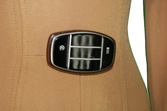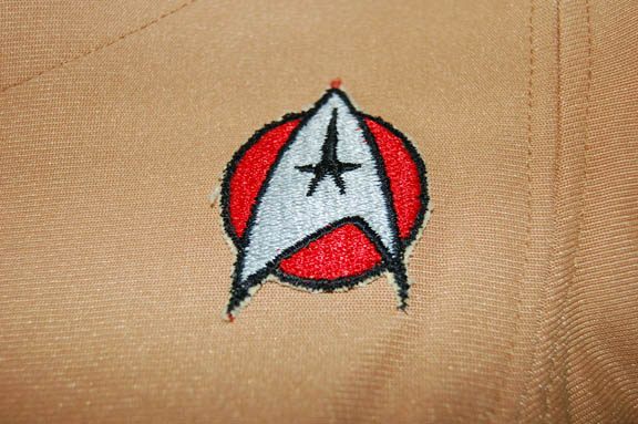 Description: A female tan Starfleet jumpsuit with plastic attached buckle. A red and gray patch denoting ‘Cadet' status has been sewn onto the left breast and orange epaulets with gold triangles are on each shoulder. A pocket made of the same fabric is on the right pant leg. The costume has a discreet zip up the back and adjustable angle cuffs allowing the wearer to get on foot wear. Sewn in tags read “Western Costume Co. – Brenda Gooch” and “Western Costume Co. – 10 Girl”.