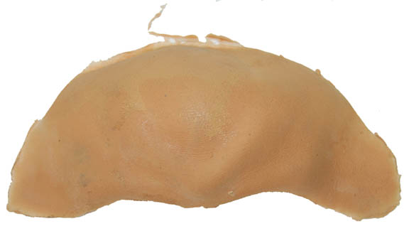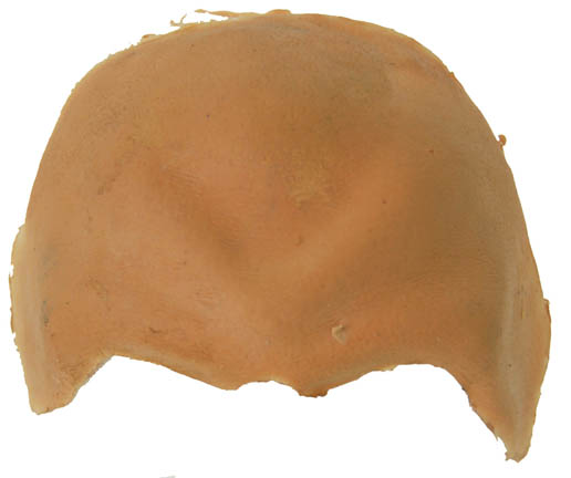 Description: During “The Original Series” of Star Trek the “Romulans” were a mysterious species with basic make-up and hair special effects. When “The Next Generation” came around, their first appearance in the 24th century was a harbinger for dangerous times ahead and in the intervening years not only had “Romulan” technology and ships changed, but their appearance as well. The ‘forehead ridges' are reminiscent of stronger bone structure than their “Vulcan” counterparts and make the differentiation between the offshoot races more evident. The style carried over into episodes of Star Trek: Voyager and especially “Deep Space Nine”. Their role eventually culminated in the 2002 feature film Star Trek X: Nemesis that featured many “Romulans” in their ‘senate chambers’, crewmen on starships, and more. Almost certainly left over from this feature this latex forehead is a special effect application cast from a mold created specifically for actors portraying these character aliens. It covers the front of the head and eyebrow and is airbrushed flesh tone.
