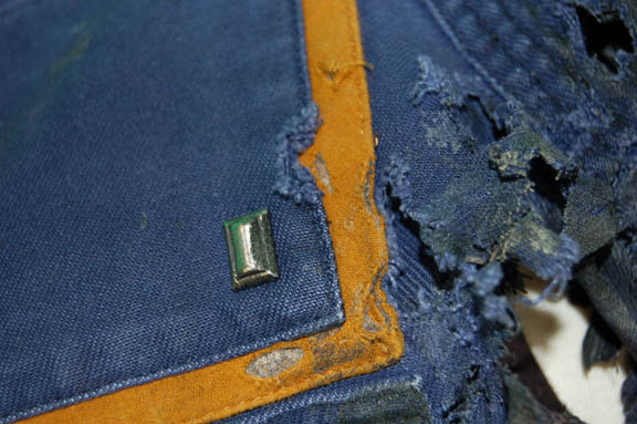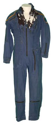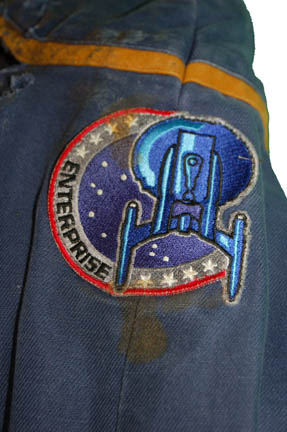 Description: This Starfleet jumpsuit was used during the Star Trek: Enterprise series and has been intentionally distressed by the Star Trek production team for special effects on the show. The blue jumpsuit featuring command gold piping around the shoulders has significant distress to the chest and neck area with minor distress on the upper legs. A slightly distressed but no less important and famous ‘Enterprise' patch is on the left shoulder. The outfit has numerous zippered pockets as well as zips and adjustable Velcro at the wrists and ankles. To accompany the jumpsuit is a black sleeveless cotton top with buttons up the front. Significant distress has been intentionally produced to the chest area to correspond with the jumpsuit. The inside sewn in costume tag reads "Enterprise - Andy Keith" as well as a removable Star Trek production tag on the jumpsuit.