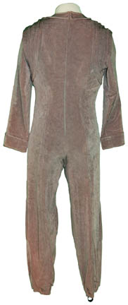 Description: The item is a spacesuit under garment from the Star Trek: Voyager episode "Blink of an Eye" in which "U.S.S. Voyager" comes across a planet with a core that creates a unique fluctuation in time, one second passing for the ship in orbit equals a day in the life of the aliens on the planet below. Having witnessed the growth of an entire civilization, "Voyager" was eventually boarded by the aliens when they discovered space travel in only a couple of "Voyager's" days later. The alien pilot who survived the attempt was "Gotana-Retz" played by Daniel Dae Kim. The costume consists of a gray jumpsuit with fine sewn in ribbing around the shoulder and at the knees, black elastic stirrups at the feet, a zip up the back to seal it with clasps at the neck, and black detachable shoulder pads. There is a Velcro patch on the left wrist cuff for placement of a 'temporal compensator'. The sewn in Voyager tag is inscribed 'Daniel Dae Kim'.