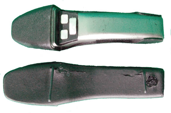 Description: Type-2 Voyager-Style phasers were used throughout the Star Trek: Voyager and Deep Space Nine series. Both of the phasers in this lot were made for background stunt work and do not come out of their holders. Made of foam rubbers painted to look like metal and a black leather case; both come with metal hooks on the back for attaching to belts. Measures approx. 7 ¾ x 2 ¼ x 2 ¼ inches.