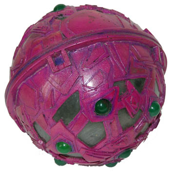 Description: This fun prop is the ‘alien gambling device' from the well-received Deep Space Nine episode “Rivals”. The conniving con artist “Martus Mazur” (Chris Sarandon) by chance comes into possession of this device that he soon discovers gives the possessor mysterious luck. After “Quark” (Armin Shimerman) turns down “Mazur’s” offer to purchase the device, “Mazur” establishes his own “Club Martus” that threatens to put “Quark” out of business. The device is an opaque spherical shell with detailed pink plastic attachments creating an intricate design over its entirety. Ten green LED lights are on the surface of the sphere that flashes intermittently at the press of a small button on the side. The internal mechanical components are powered by a standard 9V battery accessible by unscrewing the two halves of the sphere. Any battery power remaining is left over from taping the show. Measures approx. 4 inches diameter.
