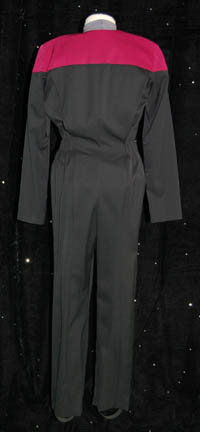 Description: This Starfleet uniform jumpsuit is black with red command division shoulders that zips up the front and clasps at the top half way up the chest, and features a Velcro patch on the left breast for a Starfleet ‘combadge' (sold separately). The waist features form fitting black elastic with sewn in loops for ‘away team’ gear, the feet end in black elastic stirrups. Each uniform comes complete with detachable shoulder pads and a gray turtleneck undershirt that zips up the back and clasps at the top. The interior tag is inscribed 'Jennifer Ferninand'.
