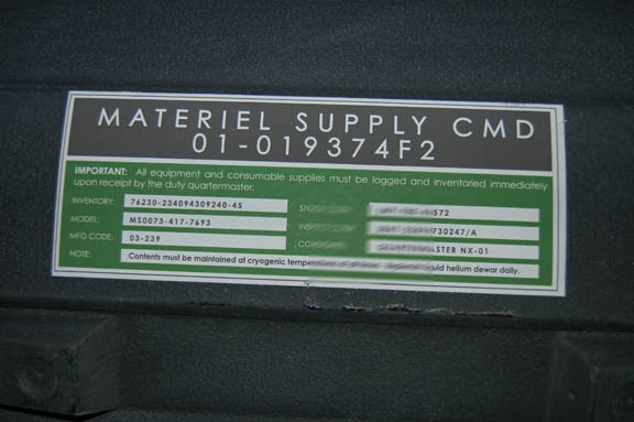 Description: A black painted plastic cargo container used as set dressing on various episodes of Star Trek: Enterprise featuring well preserved ‘Material Supply Command' applications placed on the cylindrical portion of the item and one on either end of the item for a total of four. The item measures approx. 17 X 20 X 45 inches.