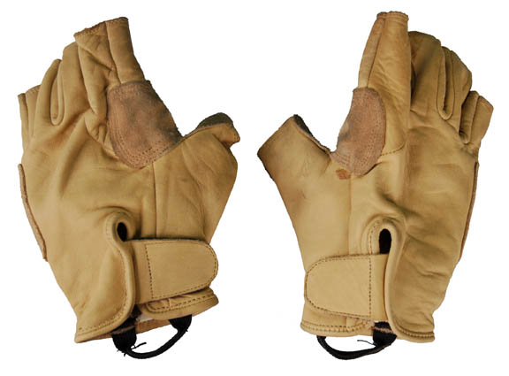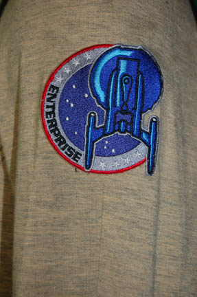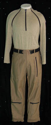 Description: Featured prominently in episodes like “Desert Crossing” and “Marauders” this light, sand colored uniform was worn by stunt actors portraying our heroes in Star Trek: Enterprise. The costume is comprised of tan pants with multiple zippered pockets and size adjustments with both zippers and Velcro. The shirt is cotton in a form fitting long sleeved tee style with black striped piping details running around the arms, a zipper running halfway down the chest, and the famous “Enterprise NX-01” logo patch sewn in on the left shoulder. The costume comes complete with two black leather belts with Velcro strips attached for ‘away team' gear and matching leather gloves with Velcro size adjustments. The interior tag is inscribed ‘Marty Murray’ and the costume tag is inscribed ‘Stunt Reed, Marty Murray, Clark Tucker’.