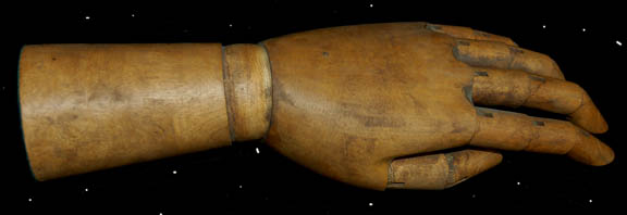 Description: This eclectic prop from the set of Leonardo Da Vinci's workshop, is made of wood and even has the joints to move the fingers up and down. Captain Janeway uses a holoprogram to visit the master himself, played by John Rhys-Davies. Da Vinci appeared in several episodes like “Scientific Method” and “Concerning Flight”. This item came from a set devoted to the character, his workshop. Measures approximately 11.5"