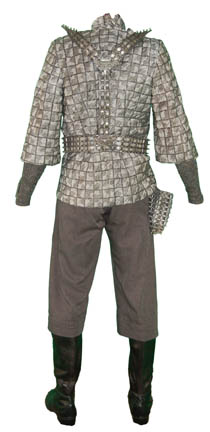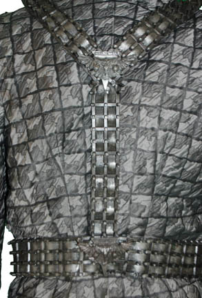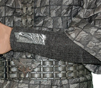Description: Feared both by neighboring species and its own government and civilians, the ‘Romulan Empire' relies on its agents in the ‘Tal’Shiar’ to look outward and inward for threats to the status quo. This costume is comprised of these elements: cropped trousers with black elastic suspenders, a uniform shirt with silver and gray checkerboard pattern with zips up the side and clasps at the top, the sleeves stop just below the elbow to allow for unattached form fitting silver sleeves with an Velcro patch to affix a cast resin, silver painted Tal Shiar badge on the left cuff, a neck wrap to simulate an undershirt that zips up the back and clasps at the top, and a vinyl belt fastened to a Y shaped harness with Velcro placements for four ‘Romulan Star Empire’ logo badges. These badges are cast resin, painted silver and feature the Imperial Eagle flying toward the viewer clutching the twin worlds of the ‘Empire’;’ Romulus’ and’ Remus’, in its talons. The ‘Tal Shiar’ badge is different in that it is rectangular in shape with a profile of the Eagle and its wing flying, featuring ‘Romulan’ character letters below. The uniform comes complete with a holster for a ‘disruptor pistol’ (sold separately).