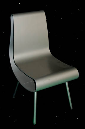 Description: This metallic silver chair made the rounds on Star Trek: Voyager. Making appearances in “Tom Paris” (Robert Duncan McNeill) and “B'Elanna Torres” (Roxann Dawson) quarters, and even in “Seven of Nine’s” (Jeri Ryan) quarters when she eventually moved out of the cargo bay. The chair is shaped wood on aluminum legs. The approx. measurements are 17 inches from the ground to the seat, the seat is 16.5 X 16.5, the back is 16.5 X 14.5, and the 34 inches from the floor to the top of the back.