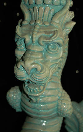 Description: This pair of Chinese-style dragons is made of cast resin painted to look like patina ceramic. The dragons each perch on an ornate base and are carrying swirling green orbs on their heads. Each measures approx. 30 ½ x 9 x 9 inches.