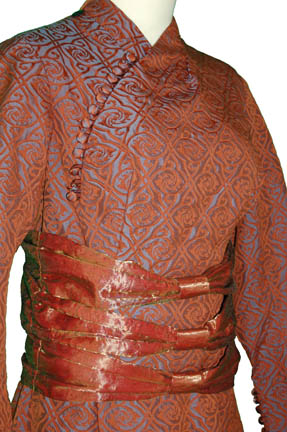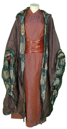 Description: Worn by Fionnula Flanagan who portrayed Vulcan Ambassador V'Lar in the episode “Fallen Hero” this dress also includes a hooded robe with outward turned cuffs; a bag of 7 replacement buttons; a belt, and a piece of Vulcan jewelry made to appear gold and jeweled. The Enterprise tag inside also indicates it was worn by 'Angela Schaub'.