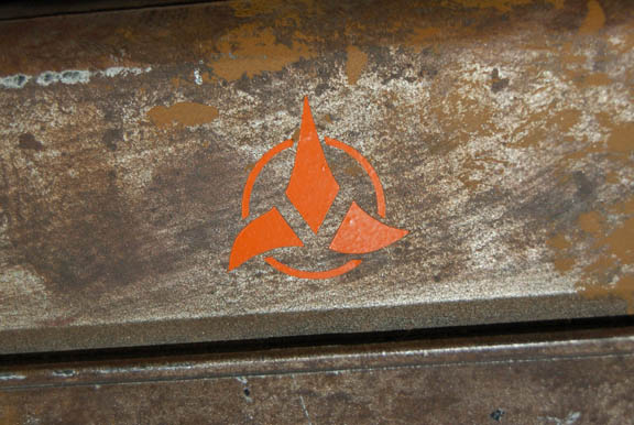Description: A plastic ‘computer' sized to be carried with by a small handle. The ‘screen’ deploys to set at an angle. The whole item has been painted a variety of browns to give it an aged appearance. An orange symbol of the Klingon Empire is present above the screen with a series of orange Klingon character letters applied down the right side of the screen. The item measures approx. 5.5 X 9.5 X 12 inches when not deployed, the screen extends out to 12 inches when pulled on its hinge. Name brands associated to this item read ‘The Sharper Image’.