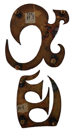 Description: A pair of badges representing ‘alien' characters comprised of polished, translucent, taupe colored paste poured into a formed metal backing. They both feature pins with clasps on back for attachment to fabric. Believed to have been worn in various Star Trek feature films. One measures 6.75 X 5.75 and the other 5.25 X 4 inches.